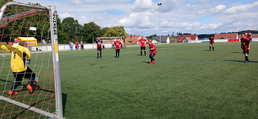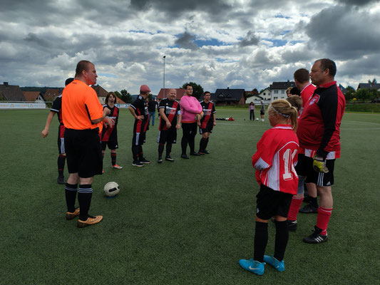 In der Extraklasse 1, dem Tummelplatz der spielstärkeren Stars, bekam es die Torfabrik mit der inklusiven Gastmannschaft der Wildsauelf zu tun. Im Trikot des FC Remblinghausen liefen deren U-17Juniorinnen auf und bekamen Unterstützung von Jugendspielerinnen des VfL Fleckenberg sowie von Präsidentenfamilie Wachholz vom TuS Sundern. Der Ball lief flott und beide Teams präsentierten sich trotz der höllischen Temperaturen laufstark und einsatzfreudig. Ausgerechnet des Trainers Tochter erzielte mit einem sehenswerten Fernschuss das 1:0 für ihre Wildsauelf und gegen die Mannschaft ihres Vaters. Nach schönem Zuspiel von Daniel Pilgram vollendete Geburtstagskind Peter Mevi zum 1:1-Endstand. Ein schöneres Geschenk hätte sich der Altmeister zu seinem 55.Wiegenfest nicht machen können. Als die Mannschaften und die ganze Tribüne "Happy Birthday" sangen, musste der stattliche Mittelstürmer dann glatt ein Tränchen verdrücken.
