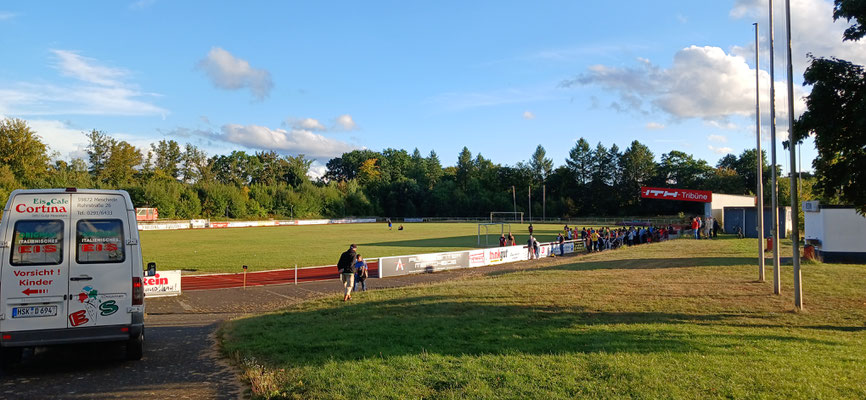 Richtet man seinen Blick vom Geläuf auf, sieht man in das Weite eines großen und wunderschön gelegenen Stadions. Nicht weit vom Stadtzentrum entfernt liegt es irgendwie versteckt und wirkt ein wenig verwunschen. Eingerahmt wird die Laufbahn rundum von hohen und dichten Bäumen, die in der Herbstsonne wie bunte Tribünen wirken. Darüber der weite Himmel des sauerländischen Hochlandes. Ein wahrhaft stimmungsvolles Rund. Eine echte "Bombonera".