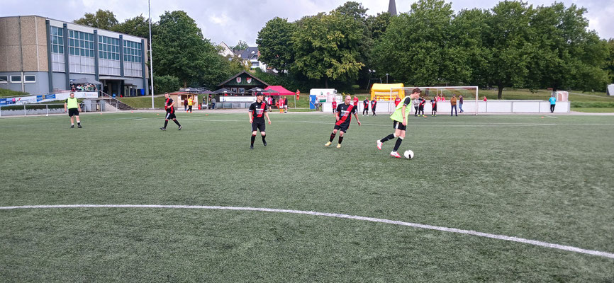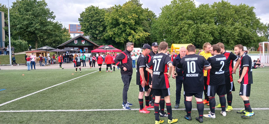 Wie schon in den vorangegangenen Begegnungen beim Röhrtal-Charity-Cup ging auch diesmal wieder der TuS mit 1:0 in Führung. Nach alter Väter Sitte drehte die Torfabrik das Spiel danach zu ihren Gunsten. Der anfänglichen Schlafmützigkeit folgte ein beachtlicher Sturmlauf. Die Mescheder Tore erzielten Johnny Eblenkamp (2), Daniel "Eisenschädel" Möller, Kevin Edeler sowie Dustin "Danger" Becker und Benny Wulf. Beide Teams traten mit großem Kader an, wechselten munter durch und lieferten ihren Schlachtenbummlern ein Duell auf Augenhöhe, in dem es wie wild hoch und runter ging.