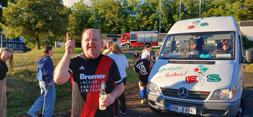In der dritten Halbzeit gab's kühle Getränke, heiße Würstchen und Signore Luigi fuhr seinen stadtbekannten Eiswagen an den Spielfeldrand. Als hors-dòuvre gab's für alle erstmal ein Eis zur Abkühlung. Nicht nur das Spiel war also ein Genuss. Noch lange über die eigentliche montägliche Trainingszeit blieben die Mannschaften zusammen und tauschten sich aus. Vielen Dank an unsere Mescheder Feuerwehr für das tolle Event! Müssen wir unbedingt nochmal machen.
