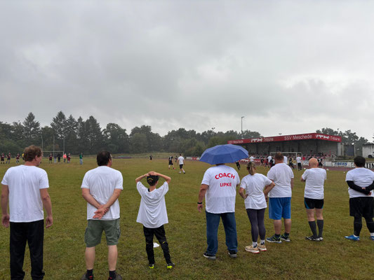 Die Bedingungen waren nahe am Grenzwert des Vertretbaren und machten den 1.Spieltag zu einer wahren Hitzeschlacht. Erinnerungen an das WM-Finale 1986 im Aztekenstadion von Mexico City wurden wach. Zumindest bei den Älteren. Der ein oder andere dürfte jedenfalls als kleine Erinnerung einen Sonnebrand mit nach Hause genommen haben. Wassereimer am Spielfeldrand, kostenloses Mineralwasser und Sonnencreme sowie der bereitstehende Sanitätsdienst des DRK gehörten bei 33 Grad sinnigerweise zum "Sicherheitskonzept". Um es vorwegzunehmen: alles ist gutgegangen.