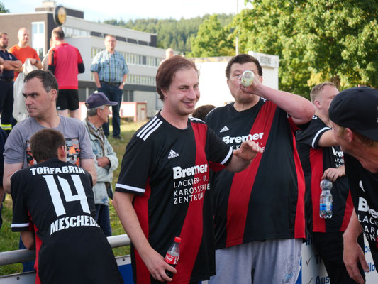 Der 1.Spieltag endete wie er begonnen hatte: mit dem Derby der befreundeten Lokalrivalen aus dem Sauerland. Diesmal im Duell der spielstärken Kicker. Das 1:0 für die Torfabrik erzielte Lars Klauke, der "Schwarze Fuß von Bödefeld", mit einem Sensationstreffer aus der Kategorie "Jahrhunderttor". Lars nahm den Ball an der Mittellinie volley, ließ ihn gefühlte Minuten durch die heiße Luft segeln, ehe er unberührt im Winkel vom TuS-Gehäuse einschlug. Ein Wahnsinnstreffer! Den Ausgleich zum zwischenzeitlichen 1:1 markierte TuS-Sturmtank Sebastian Plett mit einem Drehschuss in bester Gerd-Müller-Manier. Mit einem wuchtigen und überlegten Schlenzer von der Strafraumkante erzirkelte Torfabrik-Spielmacher Johnny Eblenkamp das 2:1 und sicherte seinen Farben damit kurz vor Schluss den neuerlichen und prestigeträchtigen Derbysieg. In der allerletzten Spielszene verletzte sich Torfabrik-Schnapper Pat Franke (beinahe) lebensgefährlich, so dass sich pünktlich mit dem Schlusspfiff endlich auch die netten Sanitäter vom Deutschen Roten Kreuz beweisen konnten. Professionell mit einer Rettungsdecke vor den Blicken der Zuschauer abgeschirmt und zwecks Überwachung seiner schwindende Vitalfunktionen voll verkabelt, berappelte sich Starkstromkeeper Franke dann doch noch und feierte seine Auferstehung nur 5 Minuten später gut gelaunt mit dem Verzehr einer Bratwurst.